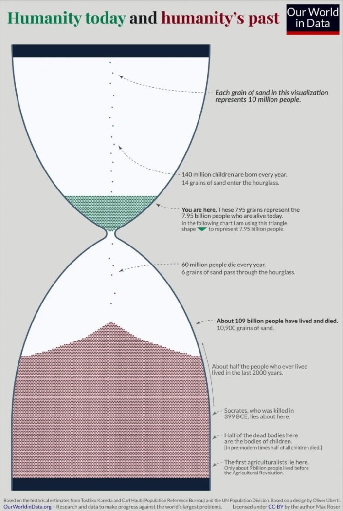Article: Visualizing Everyone that has Ever Lived — Cool Infographics How do you visualize every human that has ever lived in the last 2 million years? Max Roser with Our World in Data had the idea to turn us all into grains of sand within an hourglass, and to equate …